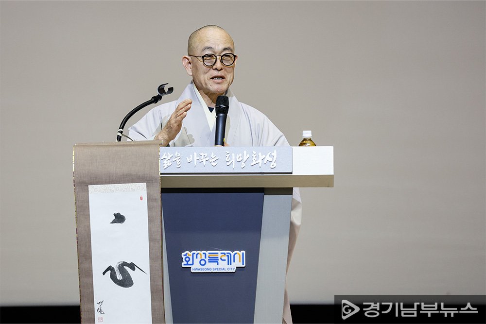 13일 화성특례시청 대강당에서 열린 2025년 제1회 명사특강에서 용주사 주지 성효 큰스님이 강연을 하고 있다.