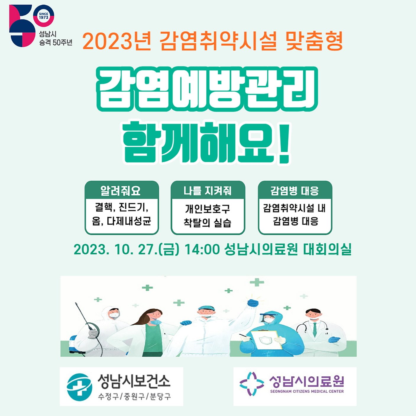 성남시는 오는 10월 27일 오후 2시 성남시의료원 지하 1층 대회의실에서 요양원 등 76곳 시설 종사자 100명을 대상으로 감염 예방 관리 교육을 한다.
