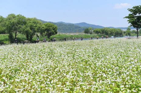 시는 탄천 내 유해식물 번식을 막기 위해 지난 3월 탄천 태평광장 주변 녹지대에 뿌린 70㎏ 분량의 메밀 씨앗이 자라 메밀꽃 군락을 이루고 있다고 14일 밝혔다.