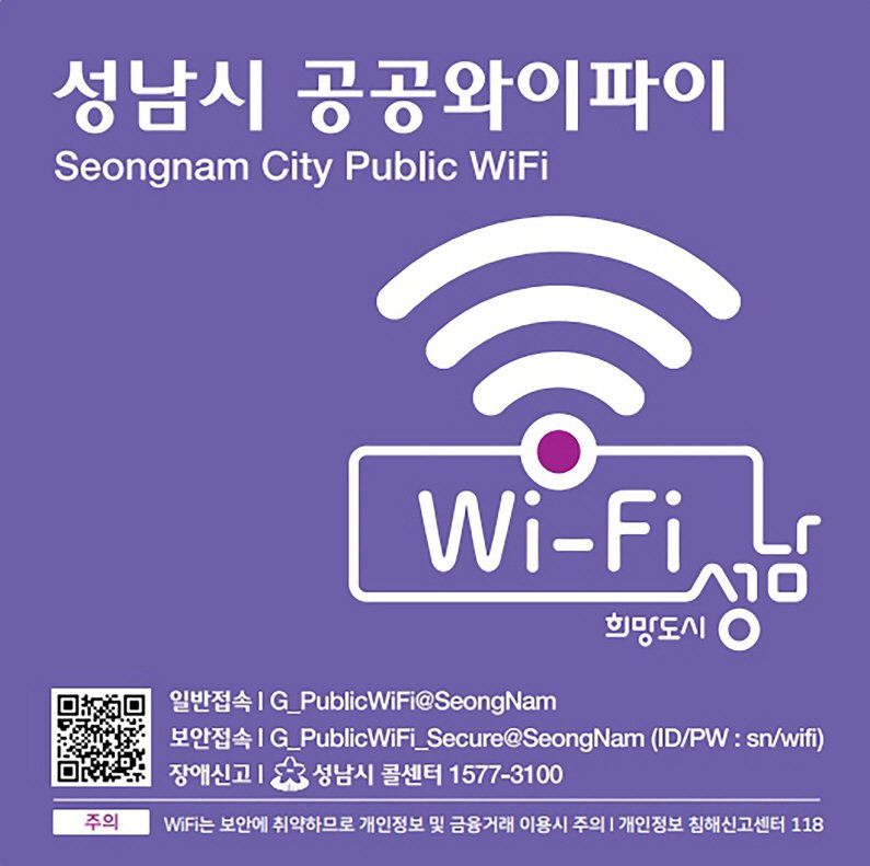 성남시 공공와이파이를 이용하려면 스마트폰의 Wi-Fi 설정에서‘G_PublicWiFi@SeongNam’이나 G_PublicWiFi_Secure@SeongNam’(ID/PW: sn/wifi)을 선택하면 된다.