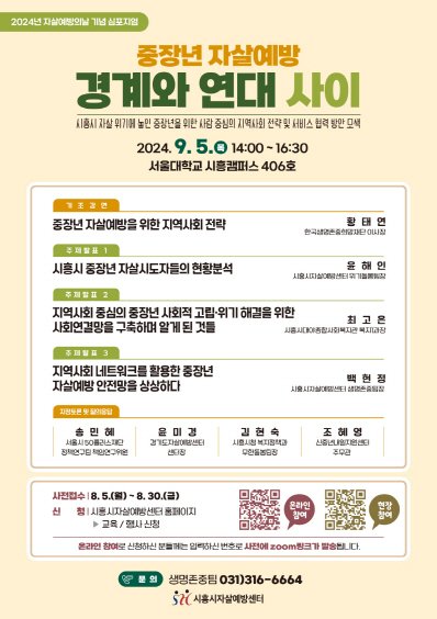 시흥시(시장 임병택)는 ‘2024년 자살 예방의 날’을 기념해 오는 9월 5일 서울대학교 시흥캠퍼스에서 ‘중장년 자살 예방, 경계와 연대 사이’라는 주제로 행사를 개최한다.