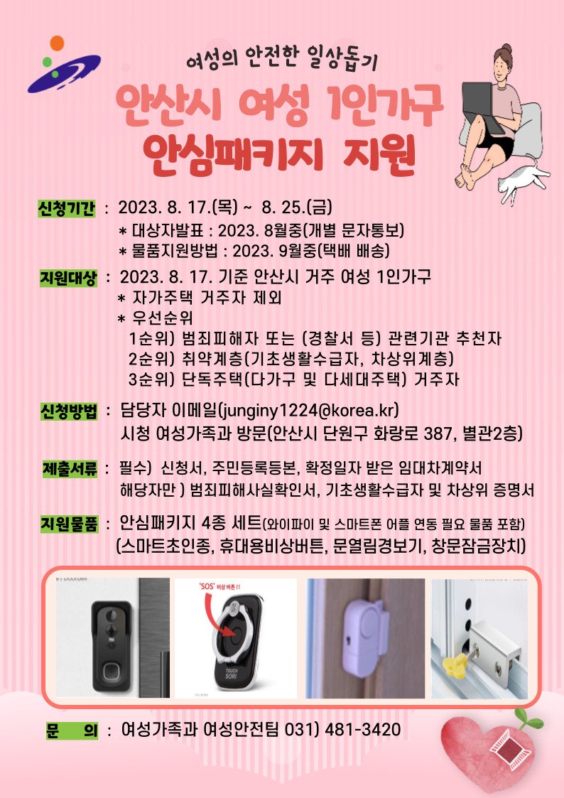 여성 1인가구 안심패키지 지원 사업은 최근 증가하고 있는 관련 범죄를 사전에 예방하고 여성의 안전한 일상을 돕기 위한 사업이다. 사업에 신청한 여성 1인 가구를 대상으로 스마트 초인종 등 안심 물품세트를 무료로 지원한다. 안산시는 총 70가구에 안심 패키지를 지원할 계획이다.
