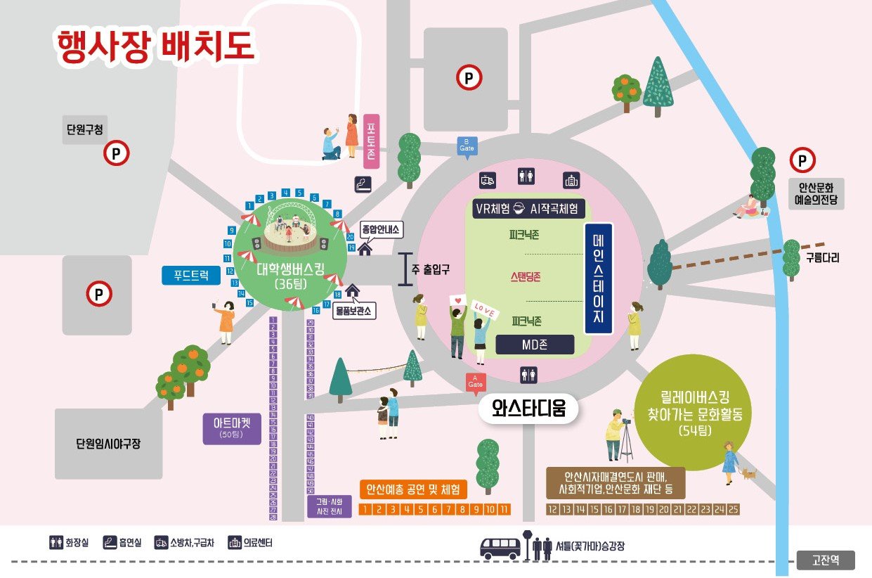 부대행사는 중앙광장뿐만 아니라 와~스타디움 남동쪽에도 마련돼 고잔역 방면에서 오는 관람객들을 반길 예정이다. 여기에는 LED 무대가 설치돼 릴레이버스킹과 찾아가는 문화 활동으로 오전 10시부터 오후 7시까지 하루 18팀(3일간 총 54팀)의 무대가 이어진다.