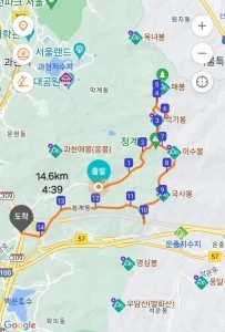 청계산공영주차장-청계산맑은숲공원-임도길-석기봉갈림길-석기봉-망경대-망경대능선-흡혈재-매봉-매바위-석기봉갈림길-이수봉-국사봉-청계산2터널위-북청계밑통로-개똥이네어린이집-참방카페-옥박골사거리버스정류장