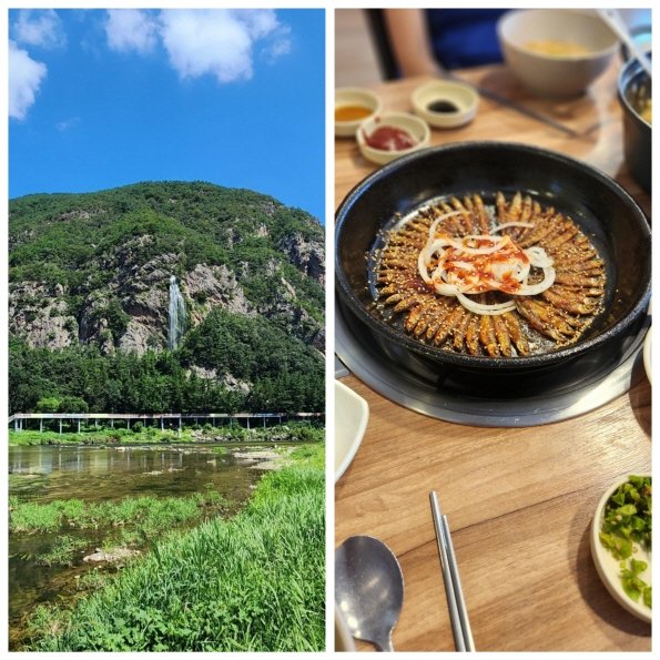 폭포수를 바라보며 원골유원지 식당에서 점심을 즐기니, 자연 속에서의 한 끼가 더욱 특별하게 느껴졌다. 기분 좋은 여운을 안고, 이제 장령산자연휴양림으로 향한다.