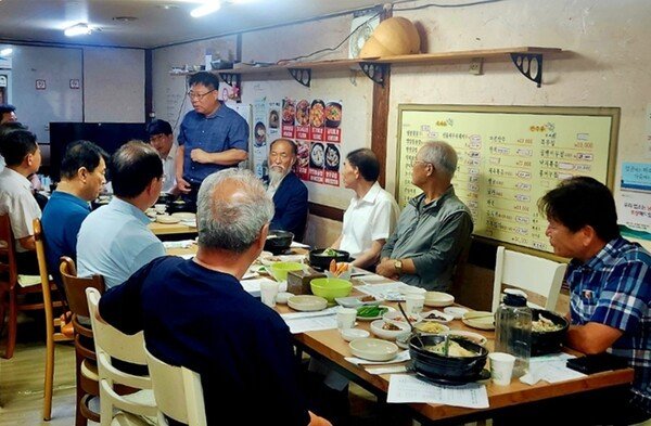 이상균 구청장이 7월 24일 지역 전통시장 상인회장들과 함께 관내 식당에서 복달임 오찬 간담회를 열고 있다.