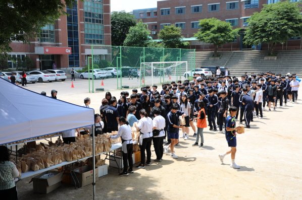 수원시자원봉사센터, 수원 ‘ESG경영실천 일자리나눔 친화기업 1호’인 ㈜갭텍, 삼일공업고등학교 학부모봉사단 등은 27일 햄버거 1200개를 만들어 학생들에게 배부하고 있다.