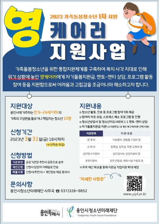 이러한 흐름에 발맞춰, 용인시 청소년미래재단에서는 관내 가족돌봄 청소년을 대상으로 자기돌봄지원금 지급(50만원 이내, 간접지원), 청소년수련관 등 8개 청소년 시설의 프로그램 참여기회 제공, 참여자 스트레스 해소 및 자조 모임 운영, 재단 직원(청소년상담사, 청소년지도사)과 청소년의 1대1 멘토-멘티 구성 등을 주요 내용으로 하는 ‘2023년 제1차 가족돌봄 청소년(영 케어러) 지원 사업’을 시작했다.