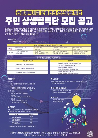 양평공사(사장 신범수, 이하 공사)는 군민 의견을 적극적으로 수렴해 모두가 행복한 시설 운영을 위한 상생협력단을 28일까지 모집한다고 밝혔다.