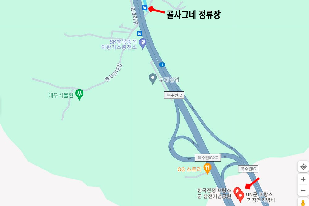 좌석 300번이나 일반 65, 777, 9000번 등의 버스를 타고 ‘골사그네’ 정류장에서 하차했다. 왔던 길을 되돌아 17분 걸으라는 길 찾기 지시대로 따라가다가 결국 돌아섰다. 여긴 사전에 길에서 내려 어떻게 돌아갈 것인지 지도를 파악하고 와야 한다. 수원에서 안양방면으로 갈 때, ‘프랑스군 참전 기념비’ 장소가 보이자마자, 북수원IC로 빠지게 되고, 버스는 조금 직진해서 ‘골사그네’정류장에 멈추기 때문이다. 구글지도나 네이버길찾기 등을 미리 파악하고 버스와 도보를 이용할 건지 정해야 한다. 아마 모두 그렇게 하시겠지? 난 25년간 보아온 길이라 안일하게 생각했던 거다.