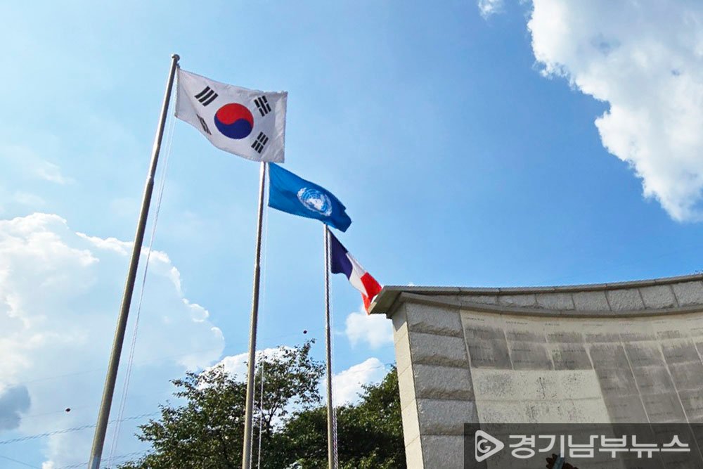 태극기, 유엔기, 프랑스기가 펄럭이는 기념 광장