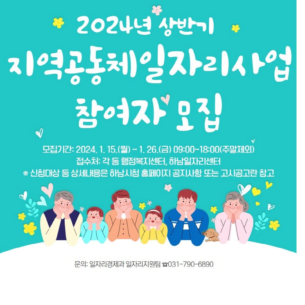 하남시(시장 이현재)가 공공분야에서 한시적 일자리를 제공하는 ‘2024년 상반기 지역공동체일자리사업’을 실시한다.