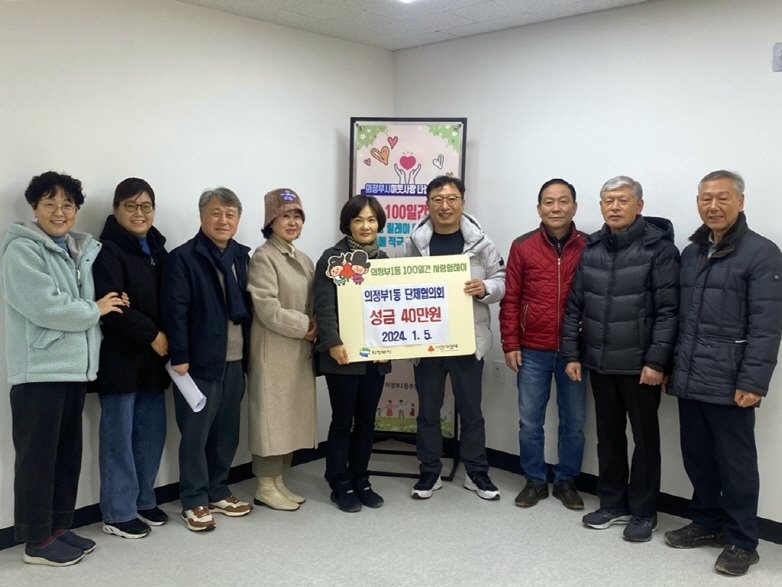 의정부시 의정부1동주민센터(동장 김영리)는 1월 5일 의정부1동 단체협의회(회장 박재경)가 ‘100일간 사랑릴레이 배턴 잇기’에 동참해 성금 40만 원을 기부했다고 밝혔다.