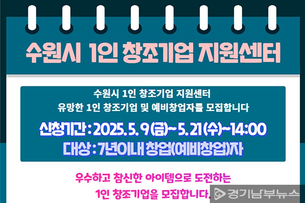 입주를 희망하는 기업은 입주신청서, 사업계획서 등을 작성해 5월 21일 오후 2시까지 전자우편(hyo596@gsmba.kr)으로 제출해야 한다. 신청서 서식은 ‘수원시 홈페이지(https://www.suwon.go.kr) > 시정소식’에 게시된 ‘2025년 수원시 1인 창조기업 지원센터 입주기업 모집 공고’에서 확인할 수 있다.