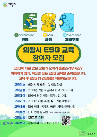 교육은 7월 12일 저녁 7시 의왕시청 별관 1층에서 진행되며, ESG에 관심 있는 누구나 7월 11일까지 QR코드를 통해 신청하면 된다. 자세한 사항은 ‘상상우리’(02-6388-7756) 또는 의왕시 자치행정과( 031-345-2133)로 문의하면 된다.