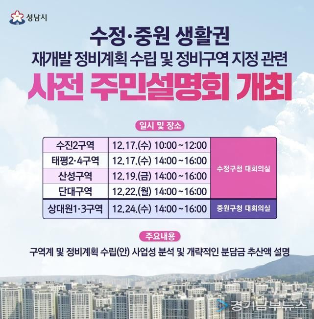 [경기남부뉴스 김혜숙 기자] 성남시는 오는 12월 17일 수진2구역을 시작으로 수정·중원 생활권 5개 구역의 재개발 정비계획 수립 및 정비구역 지정에 대한 사전 주민설명회를 순차적으로 개최한다.
