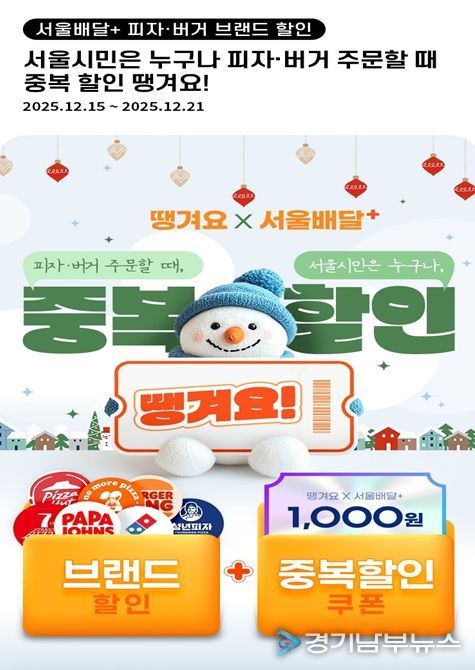 한편 피자헛, 도미노피자, 파파존스, 청년피자, 7번가피자, 노모어피자, 버거킹 등 7개 브랜드는 21일까지 ‘땡겨요’를 통해 브랜드별 할인쿠폰을 발행하는 공동 프로모션을 추진한다. 서울시는 국내 주요 피자·햄버거 프랜차이즈와 11월 27일 '서울배달+ 땡겨요 활성화를 위한 상생협약식'을 개최한 바 있다.