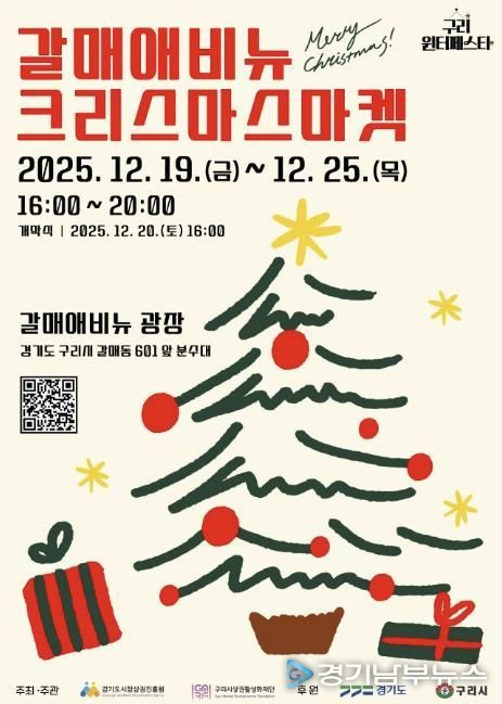 [경기남부뉴스 김혜숙 기자] 구리시상권활성화재단은 오는 12월 19일부터 25일까지 갈매 애비뉴 광장에서 ‘2025 구리윈터페스타–갈매애비뉴 크리스마스 마켓’을 개최한다고 밝혔다.