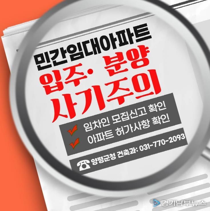 [경기남부뉴스 김혜숙 기자] 양평군은 최근 관내에서 장기일반 민간임대주택 투자와 관련한 문의가 증가함에 따라 군민들의 주의를 당부했다.