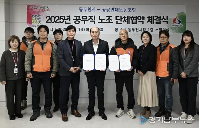 [경기남부뉴스 김혜숙 기자] 동두천시와 공공연대노동조합 동두천지부는 지난 16일 동두천시청 1층 소회의실에서 2025년 공무직 노조 단체협약 체결식을 개최했다고 밝혔다.