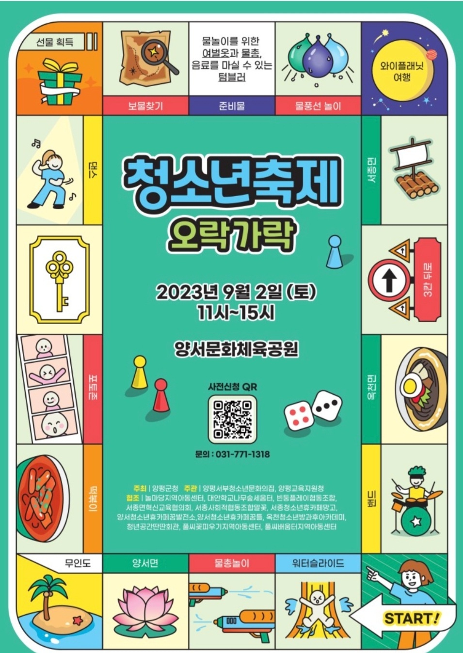 지난 9월 2일 어린이와 청소년, 지역주민들이 한자리에 모여 일상에서의 즐거움을 더하고 세대와 이웃 간의 관계를 연결하는 취지로 양서문화체육공원에서 다채로운 체험을 할 수 있도록 “2023년 청소년축제 오락가락”을 성공적으로 마쳤다.