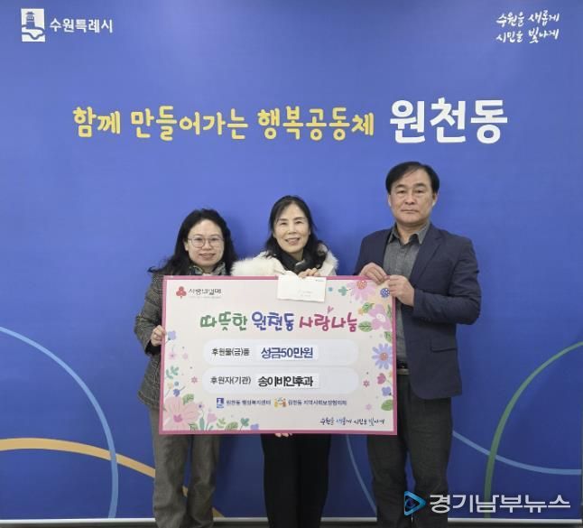 [경기남부뉴스 김정옥 기자] 지난 18일, 원천동에 소재한 송이비인후과는 지역사회 나눔 실천의 일환으로 원천동행정복지센터에 성금 50만 원을 기부했다.