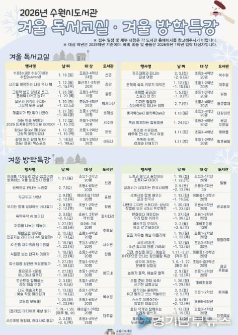 수원시도서관 관계자는 “겨울방학 동안 아이들이 책과 가까워지고 다양한 경험을 쌓을 수 있도록 프로그램을 준비했다”며 “도서관이 배움과 휴식이 공존하는 공간이 되길 바란다”고 말했다.