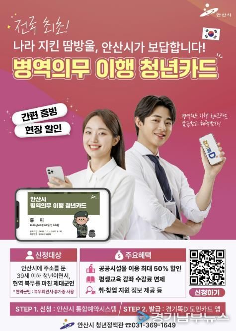 [경기남부뉴스 김혜숙 기자] 안산시는 내년 1월부터 병역의무를 성실히 이행한 청년을 예우, 지원하기 위해 전국 최초로 ‘병역의무 이행 청년카드’를 온라인으로 발급한다고 22일 밝혔다.