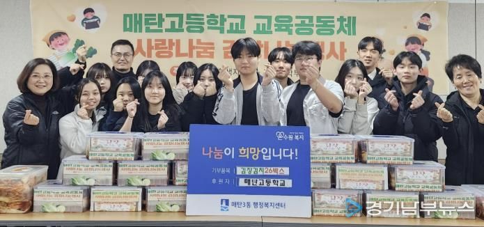 [경기남부뉴스 김정옥 기자] 매탄고등학교는 지난 19일, 교사·학생·학부모가 함께 참여해 마련한 김장김치 26박스를 매탄3동행정복지센터에 전달하며 지역사회에 따뜻한 나눔을 실천했다.