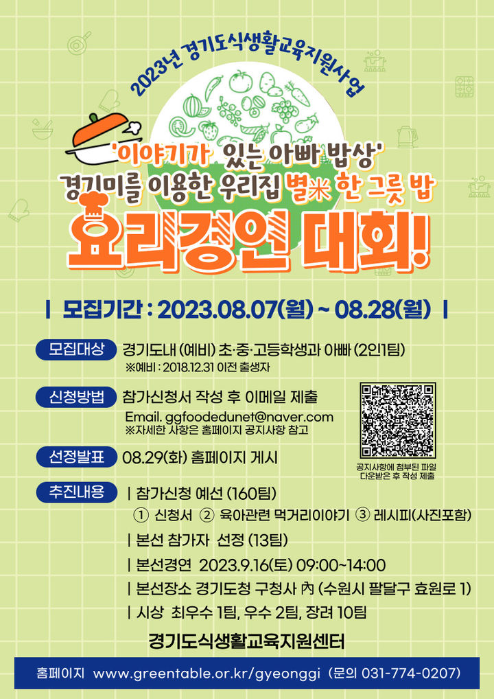 누구나 대회를 참관할 수 있으며 경기도식생활교육지원센터 누리집 등(www.greentable.or.kr/gyeonggi, 문의: 031-774-0207, 070-4032-7408)을 통해 자세한 사항을 확인할 수 있다.