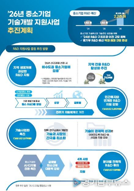 [경기남부뉴스 김혜숙 기자] 중소벤처기업부와 산업통상부는 양 부처가 추진하는 R&D사업의 지원내용·대상·절차·일정 등을 담은 ‘26년도 R&D사업 통합시행계획’을 함께 공고한다고 밝혔다.