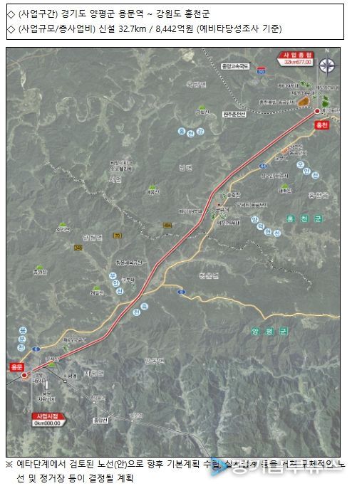 [경기남부뉴스 김혜숙 기자] 국토교통부는 12월 22일 열린 재정사업평가위원회(기획재정부 주관)에서 용문~홍천 광역철도 건설사업이 예타를 통과하고, 증평-호법 등 2개 고속도로 확장사업이 예타 대상 사업에 선정됐다고 밝혔다.