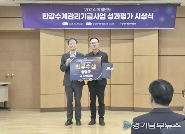 [경기남부뉴스 김혜숙 기자] 양평군은 지난 19일 한강유역환경청이 실시한 ‘2024년도 한강수계관리기금 성과평가’에서 주민지원사업 부문 최우수, 오염총량관리사업 부문 장려를 수상했다고 밝혔다.