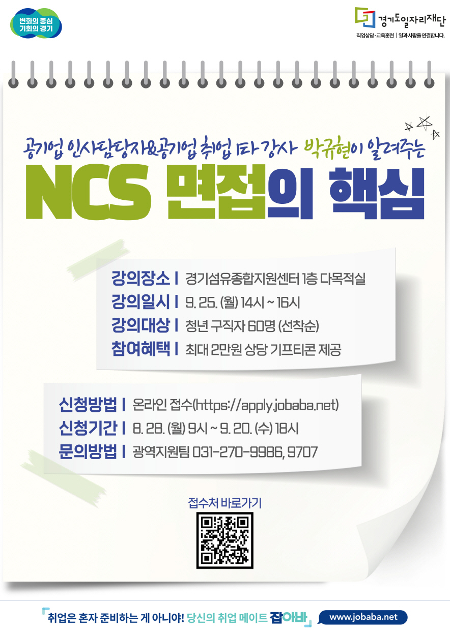 특강 참석은 오는 20일까지 잡아바 어플라이 누리집(https://apply.jobaba.net)에서 선착순으로 신청 가능하다. 기타 자세한 사항은 경기도일자리재단 광역지원팀(031-270-9986, 9707)으로 문의하면 된다.