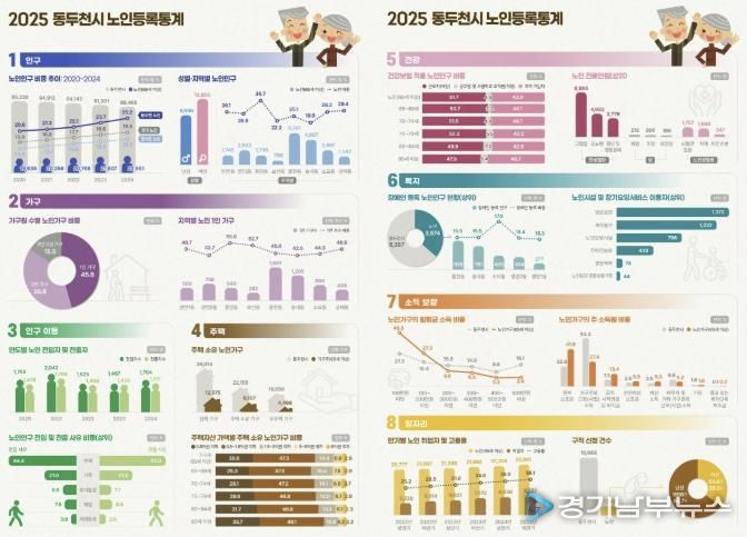 이번 통계는 경인지방통계청과의 업무협약을 통해 인구·가구·인구 이동·주택·건강·복지·소득·일자리·안전 등 9개 핵심 분야, 총 82개 항목을 대상으로 행정자료와 기존 통계자료를 연계·결합해 세밀하게 구성했다. 조사 대상은 2024년 기준 동두천시에 주민등록이 된 만 65세 이상 노인이다.