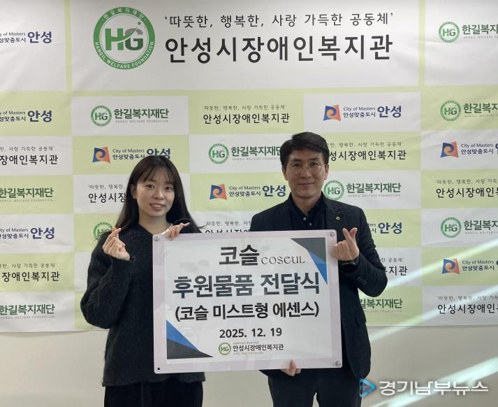 [경기남부뉴스 김혜숙 기자] 사회복지법인 한길복지재단에서 수탁하고 있는 안성시장애인복지관은 지난 12월 16일, 코스메틱 브랜드 코슬(COSEUL)로부터 미스트형 에센스 50개(약 2,900,000원 상당)를 기부받았다고 밝혔다.