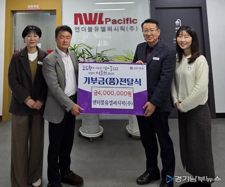 [경기남부뉴스 김혜숙 기자] 서운면 관내 업체 엔더블유엘퍼시픽㈜가 연말을 맞아 지난 23일 이웃돕기 성금 400만원을 서운면 공동모금회에 전달했다.