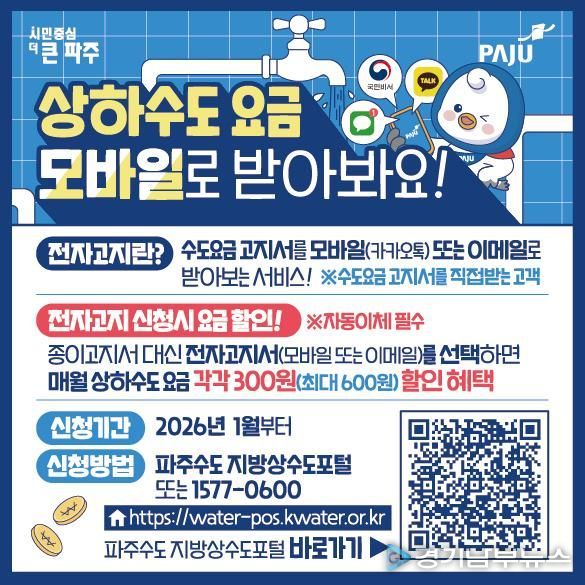 [경기남부뉴스 김혜숙 기자] 파주시는 2026년 1월부터 수도요금 전자고지와 자동납부를 동시에 신청하는 시민에게 수도요금을 할인하는 제도를 시행한다고 밝혔다.