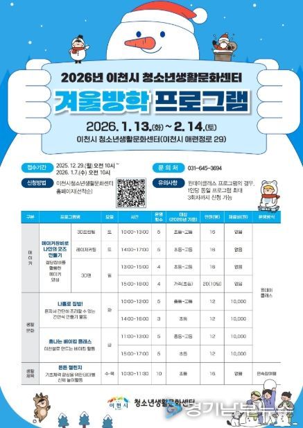 [경기남부뉴스 김혜숙 기자] 이천시 청소년생활문화센터가 2026년 정식 운영을 앞두고, 관내 청소년들의 알찬 겨울방학을 지원하기 위해 1월 13일부터 2월 14일까지 ‘2026년 겨울방학 프로그램’을 운영한다고 밝혔다.