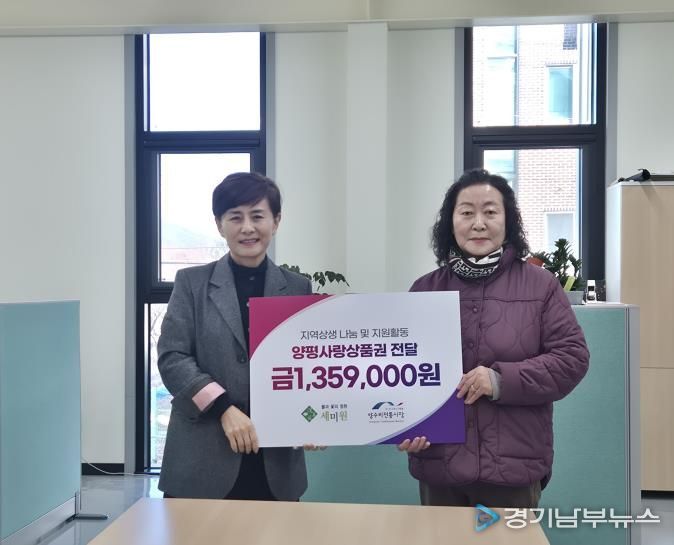 [경기남부뉴스 김혜숙 기자] 재단법인 세미원은 지난 22일 최근 관람객이 기부한 양평사랑상품권 총 135만 9천 원을 양수리전통시장상인회에 기부했다고 밝혔다.