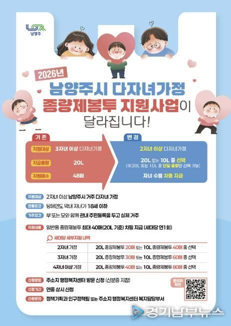 [경기남부뉴스 김혜숙 기자] 남양주시는 내년 1월부터 ‘다자녀가정 종량제봉투 지원사업’ 대상을 2자녀 이상 가정으로 확대 운영한다고 26일 밝혔다.