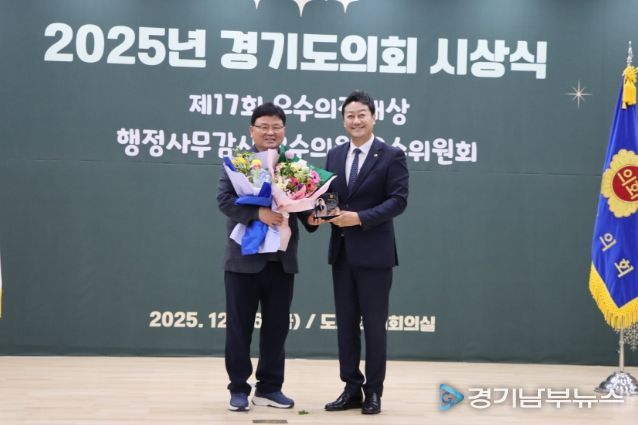 [경기남부뉴스 김혜숙 기자] 경기도의회 교육기획위원회 이택수 의원(국민의힘, 고양8)과 성기황 의원(더불어민주당, 군포2)이 26일 열린 2025년 경기도의회 시상식에서 ‘2025년 행정사무감사 우수위원’으로 선정됐다.