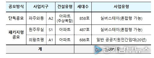 ②택지공모는 약 2천호 규모로 실시하며, 사업 대상지는 파주와동 A2 블록, 원주무실 S1 블록, 의왕초평 A1 블록 총 3곳이다. 파주와동 A2 블록과 원주무실 S1 블록은 실버스테이로, 의왕초평 A1 블록은 임대의무기간이 20년인 일반 공공지원민간임대로 공급한다.