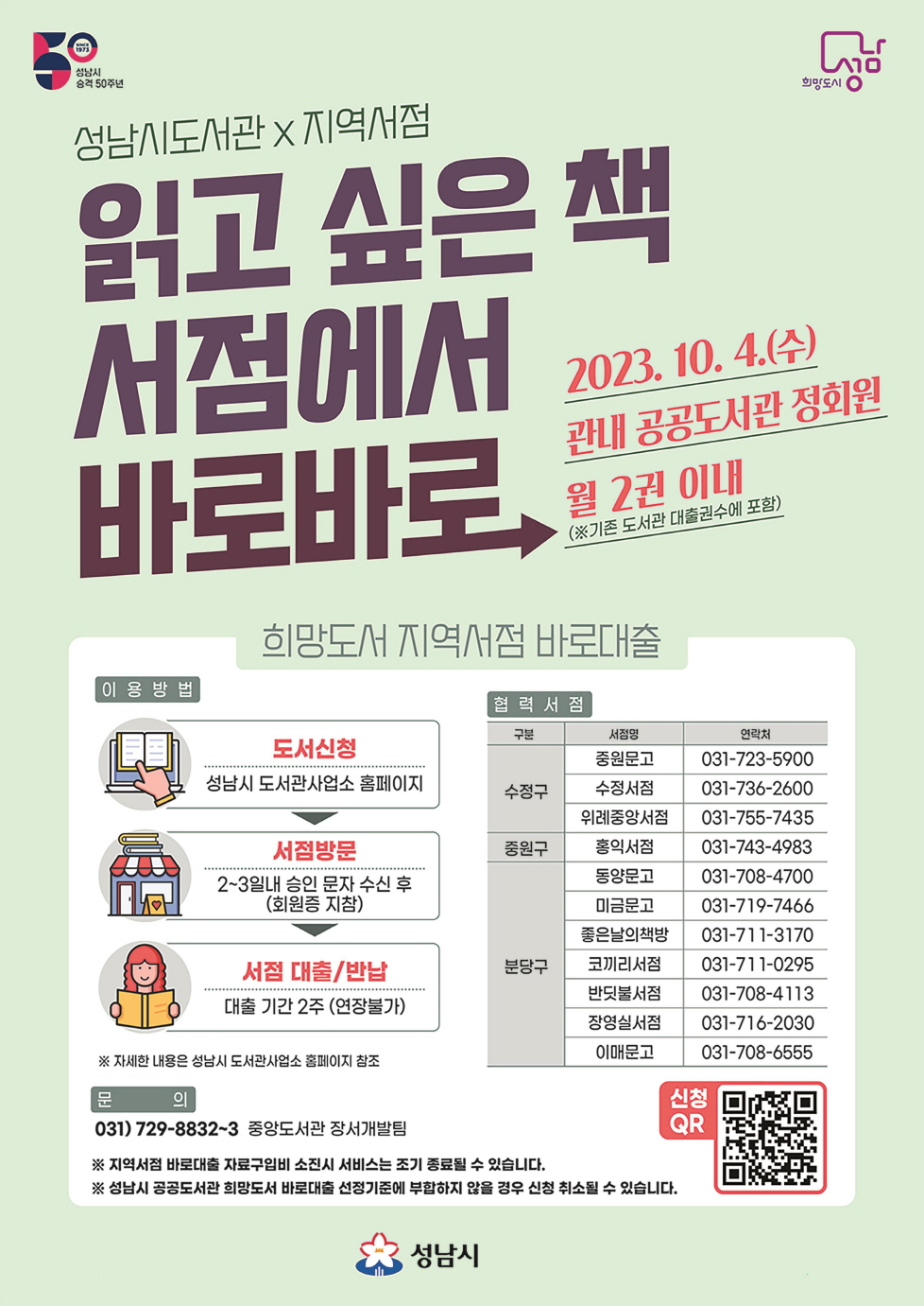 이들 서점에서 책을 빌리려면 성남시 도서관사업소(https://www.snlib.go.kr) 회원 가입→ 도서 신청→ 2~3일 내 안내 문자 수신→도서관 회원증 지참 후 해당 서점 방문 등의 절차를 밟으면 된다.