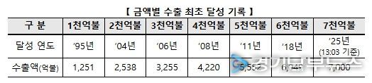 수출 7,000억 달러는 ‘18년도 6,000억 달러 달성 이후 7년만에 이뤄낸 쾌거로 전(全) 세계에서 6번째로 달성하며 수출강국 위상을 재확인했다. 특히, 6천억불은 7번째로 달성했으나, 7천억불은 6번째로 달성하며 우리 수출이 글로벌 주요국 대비 빠르게 성장하고 있음을 증명했다.