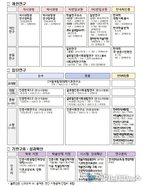 둘째, 대학연구소 중심의 인문사회 분야 연구 거점을 육성하고 신진 연구자 양성 및 융복합 연구 확대를 위해 다양한 집단 연구 사업을 지원한다.