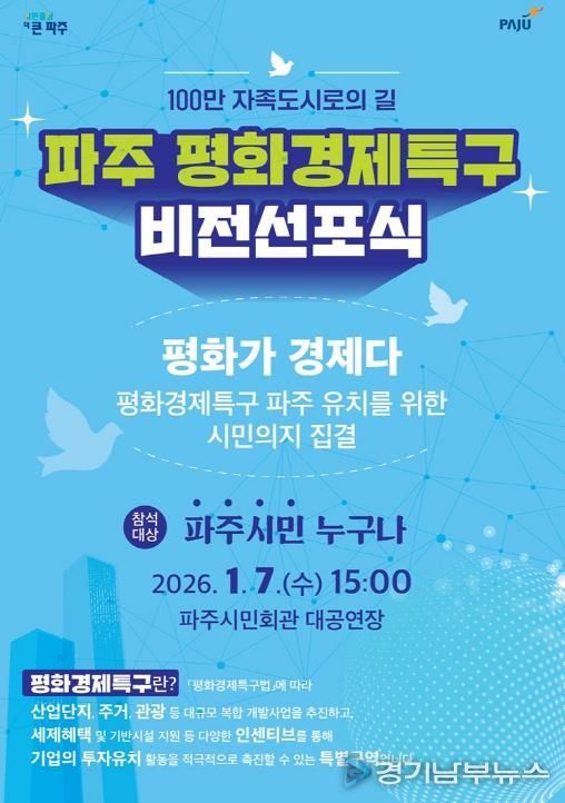 [경기남부뉴스 김혜숙 기자] 파주시는 오는 1월 7일 15시, 파주시민회관 대공연장에서 ‘파주 평화경제특구 비전선포식’을 개최한다고 밝혔다.