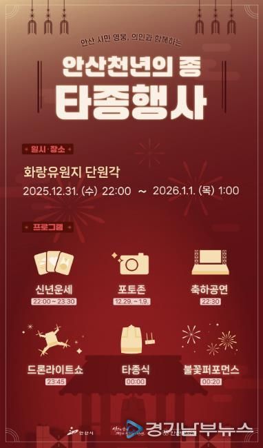 [경기남부뉴스 김혜숙 기자] 안산시는 오는 31일 오후 10시부터 화랑유원지 단원각에서 ‘2026 안산 천년의 종 타종 행사’를 개최한다고 30일 밝혔다.
