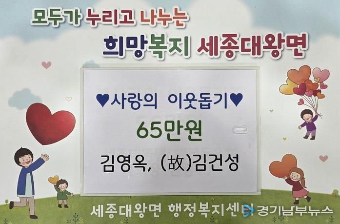 [경기남부뉴스 김혜숙 기자] 지난 29일 세종대왕면 구양리에 거주하는 김영옥, (故)김건성께서 관내 어려운 이웃을 위한 성금 65만원을 세종대왕면 지역사회보장협의체에 기탁했다.