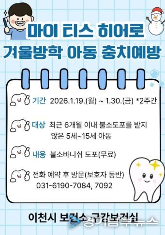 이천시 보건소는 “겨울방학 기간을 활용한 이번 불소 바니쉬 도포 사업을 통해 아동의 충치 예방 효과를 높이고, 조기 관리로 치과 치료비 부담을 줄일 수 있을 것으로 기대한다”며 “많은 보호자와 아동의 적극적인 참여를 바란다”라고 밝혔다.